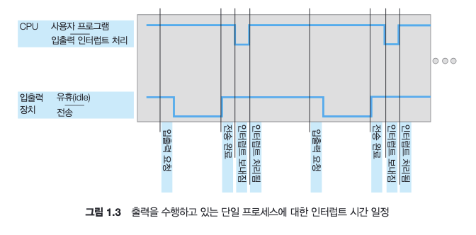 CPU는 인터럽트를 포착(catch)하여 인터럽트 핸들러로 디스패치(dispatch)한다. 핸들러는 장치를 서비스하여 인터럽트를 지우고(clear), 원래의 흐름으로 복원한다. (return_from_interrupt 명령어)