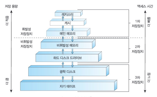 다양한 저장장치 시스템은 저장 용량 및 액세스 시간에 따라 계층 구조로 구성될 수 있다.
