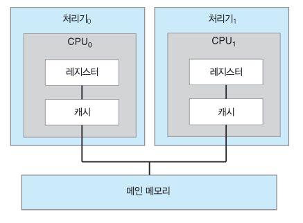 최신 컴퓨터는 각각 단일 코어 CPU가 있는 두 개 이상의 프로세서를 가진다. (다중 처리기 시스템)