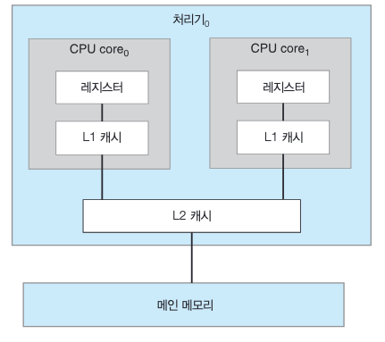 - 각 코어에는 자체 레지스터 세트와 L1 캐시가 있다.